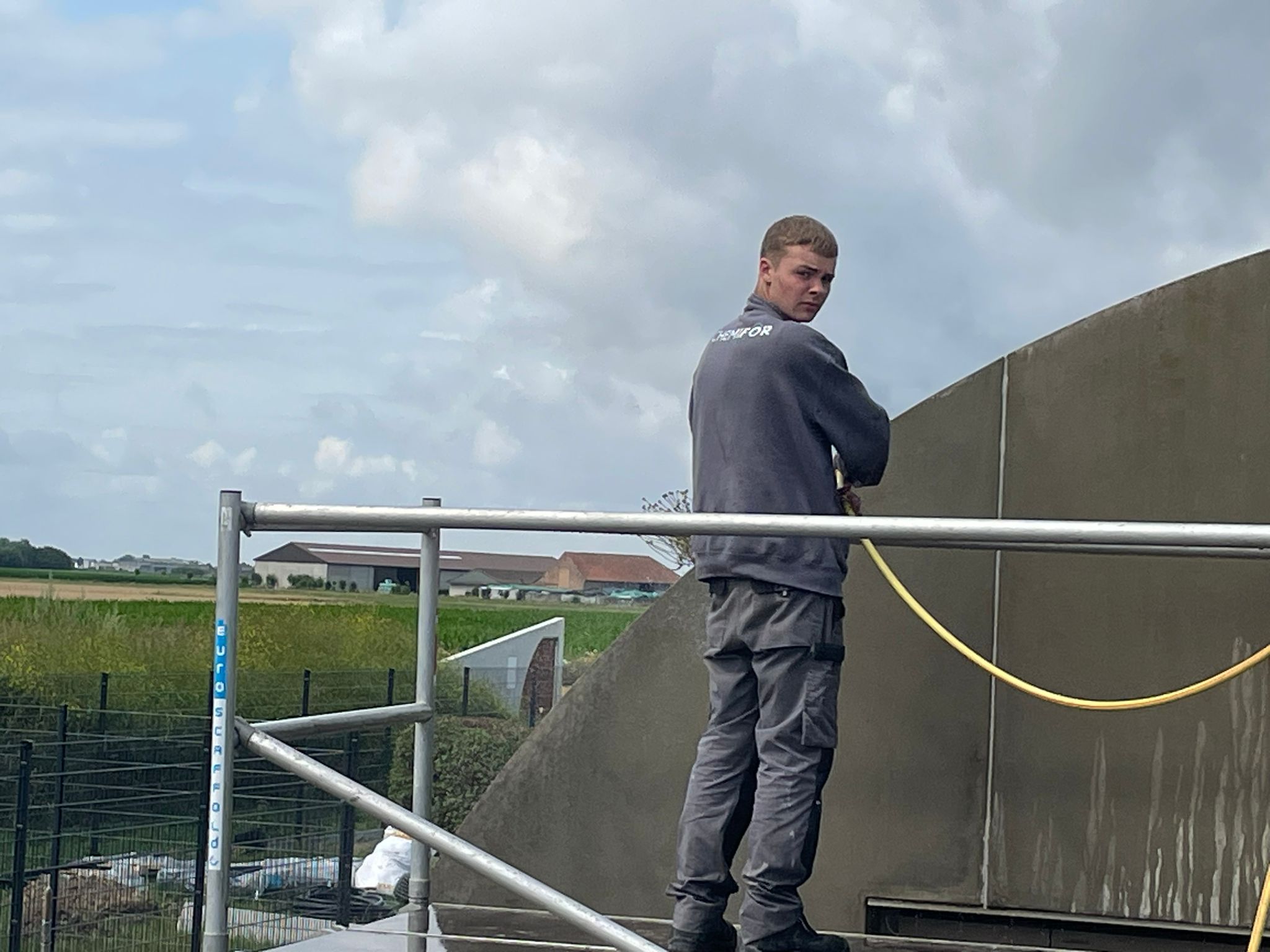 Deze 17-jarige zult u niet op kantoor tegenkomen want hij is niet gemaakt om stil te zitten. Zet hem maar op werven zodat hij de hele tijd in beweging is. En daar hoort hij ook thuis! Als volwaardig lid van het buitenteam (nee, hij moet niet enkel opruimen en vegen als jobstudent) gaat hij mee de werven op. Zo leert hij de technieken van het reinigen, krijgt hij voeling met elke ondergrond en verwijdert hij elke vervuiling met het juiste reinigingsproduct.