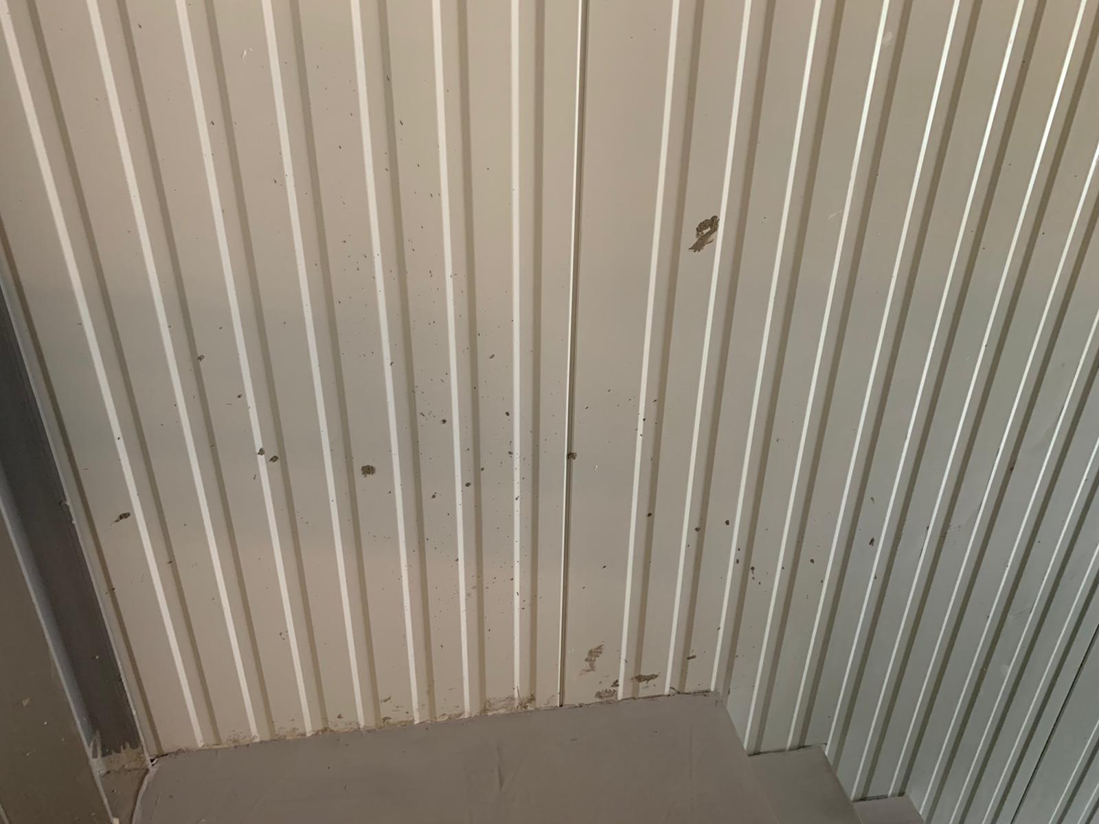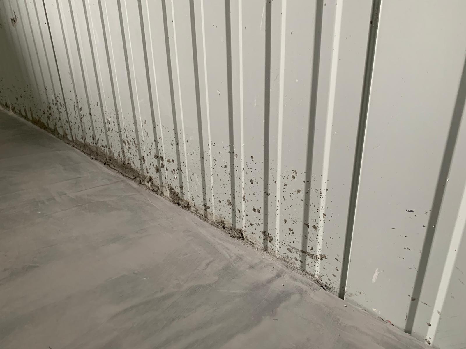 Helaas is het helemaal niet tot in de puntjes afgewerkt, de “puntjes” cement zitten tot op 3 meter hoogte op onze sandwichpanelen. Overal zitten er grote en kleine spatten cement.