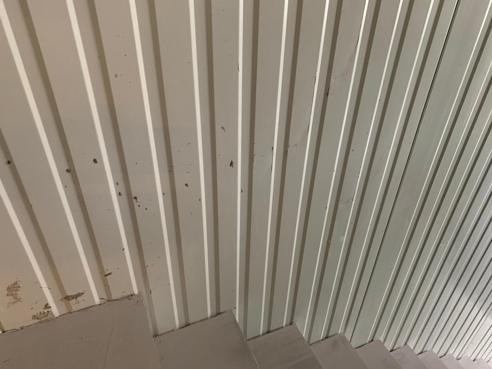 Daarnaast moet er opgepast worden omdat de trap en de vloer ook uit “cement” bestaat, dus ook hier moeten we oppassen dat dit product niet op de vloer en trap terecht komt zodat er op deze plaatsen geen nieuwe schade komt. Wij kunnen deze werken voor u uitvoeren zodat we u kunnen helpen met terug propere sandwichpanelen.