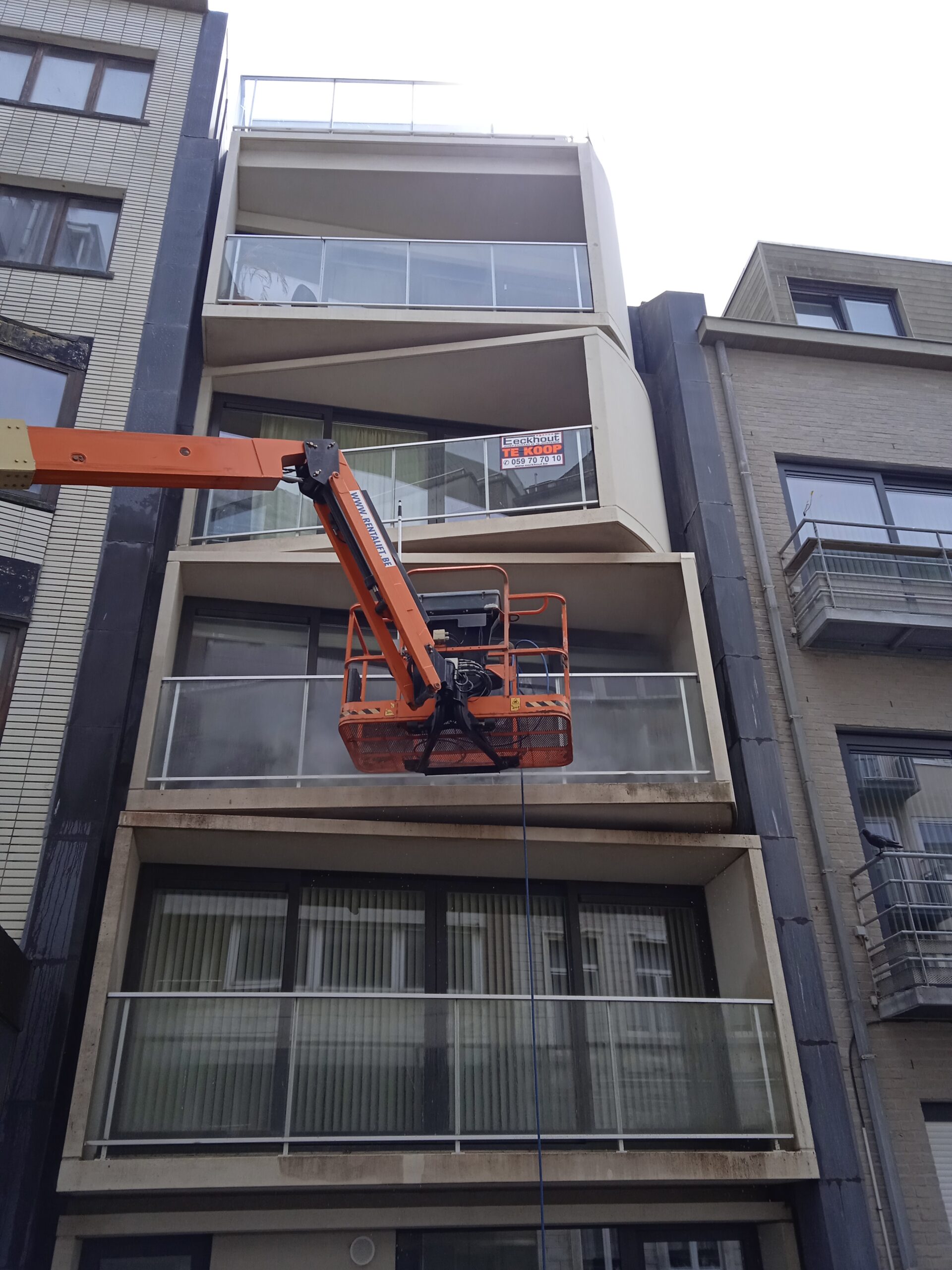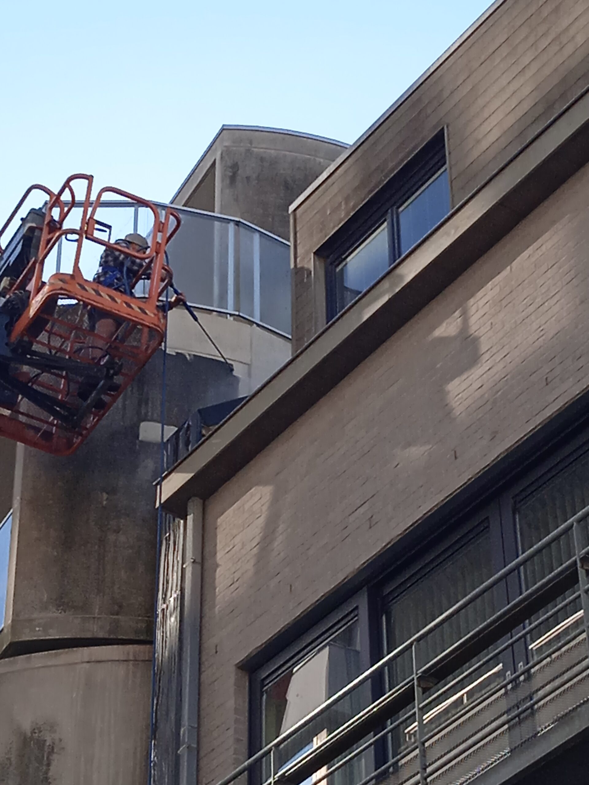 Voor deze klant werd gekozen om de gevel en balkons te reinigen met stoom in combinatie met Chemifor Gevelreiniger. We brachten het aangelengde product aan op een natte ondergrond in kleine oppervlakken door middel van een drukspuit. We lieten dit product enige tijd inwerken, om dan de muren en terrassen te borstelen met een handborstel om de vervuilingen optimaal te verwijderen. Nadien werd met stoom het product en de vervuilingen van de betonelementen afgespoeld.