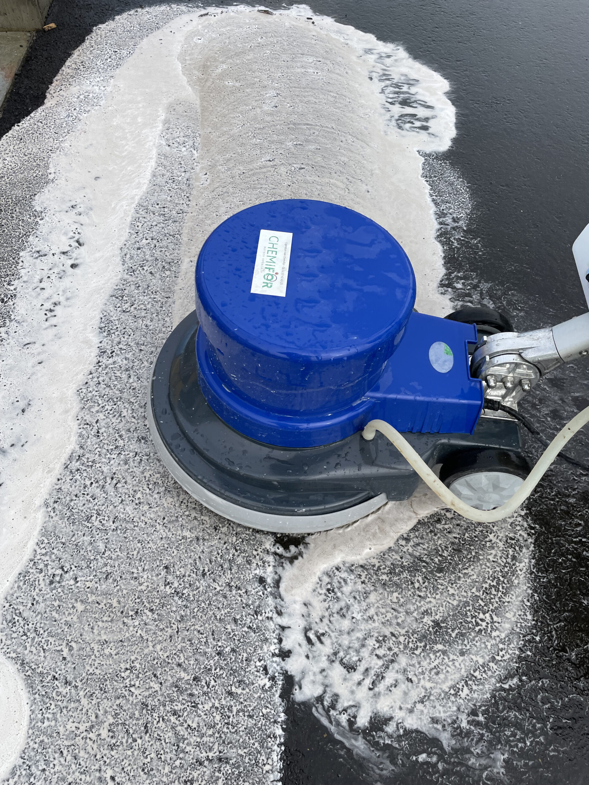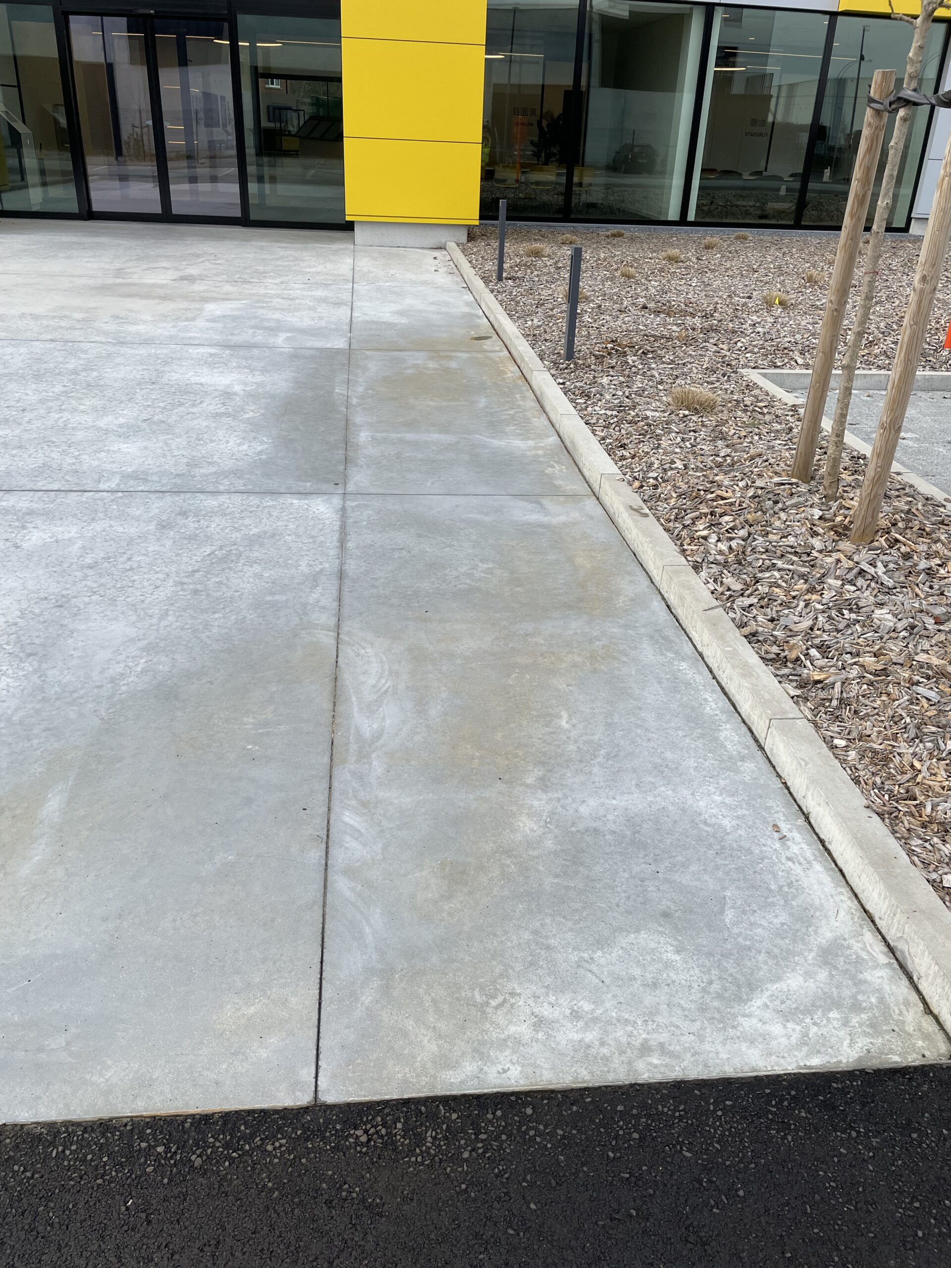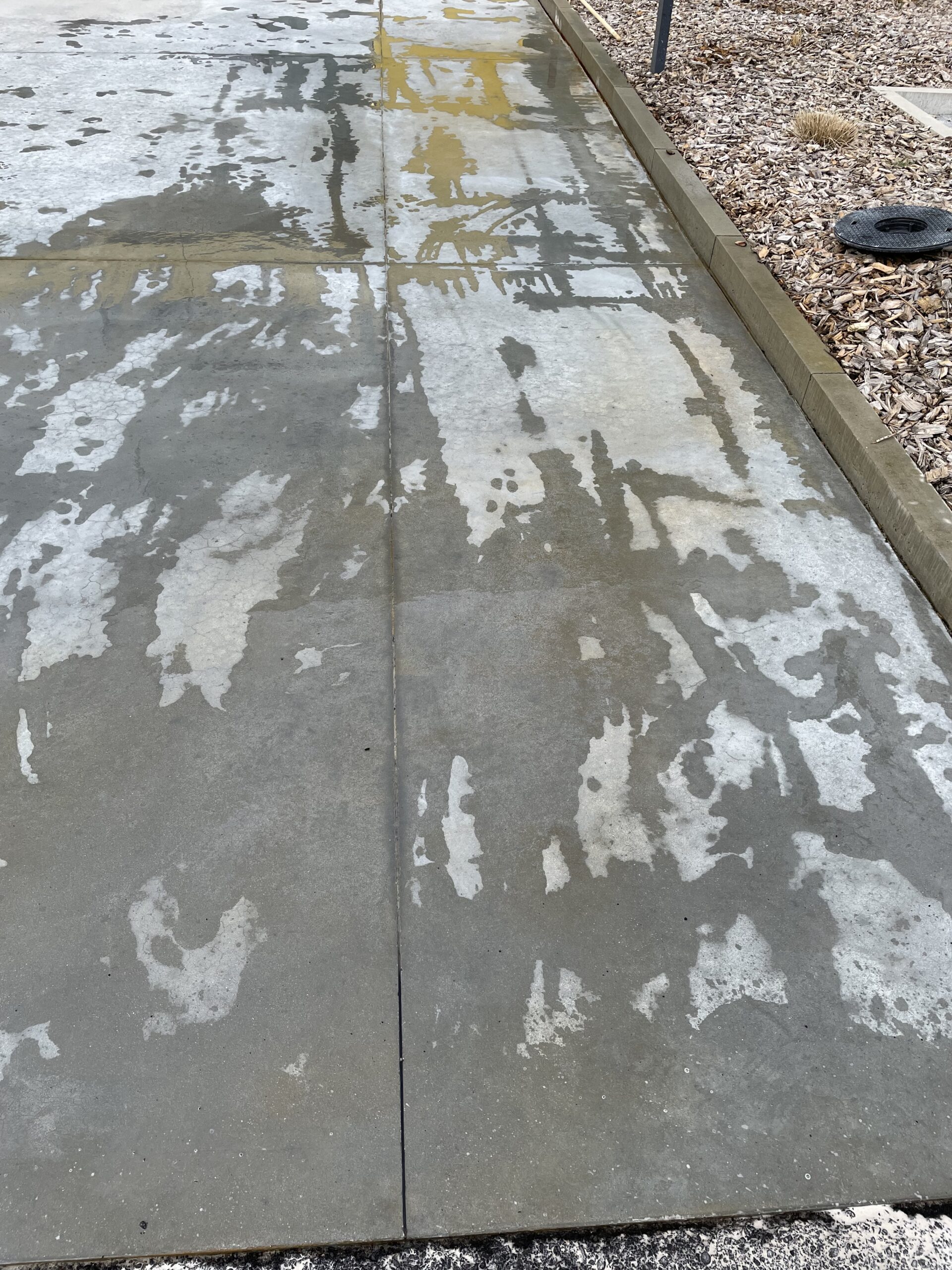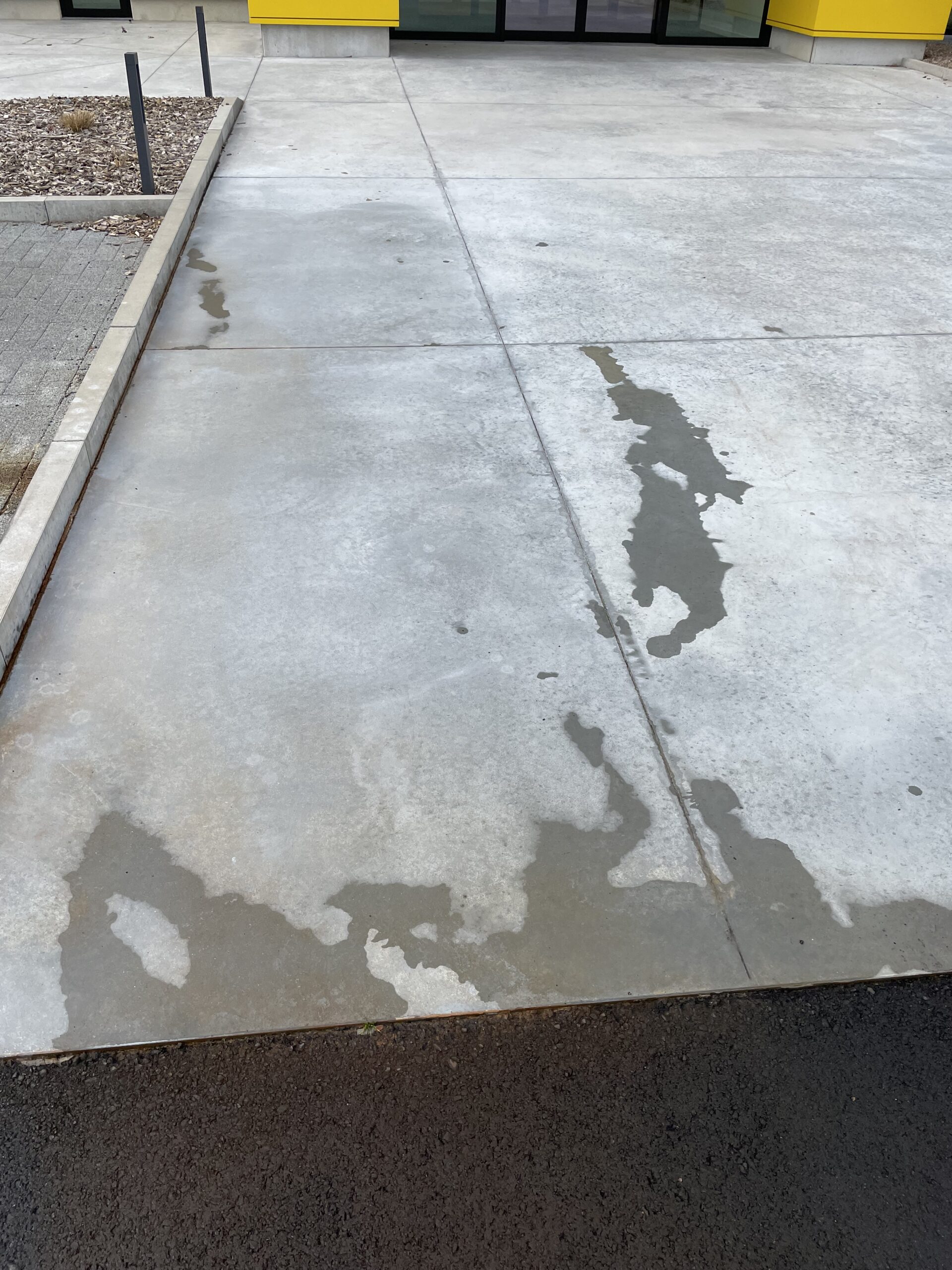 De oprit van dit bedrijf was vervuild met 2 grote vlekken van roestwater. Dit was veroorzaakt door een grote hoeveelheid water die vrij kwam bij een putboring. Bij zo’n boring komt er grondwater naar het oppervlak. Dit water bevat vervuilingen en dit is zo terecht gekomen op de beton. Wanneer het oppervlak dit water opzuigt, houdt hij de vervuiling vast waardoor de oppervlakte vuil wordt. Dit is helaas met naspoelen niet meer weg te krijgen.