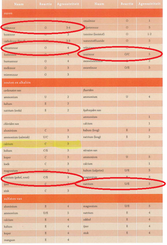 • Citroenzuur: 4: Sterk agressief (Reactietype: oplossing)