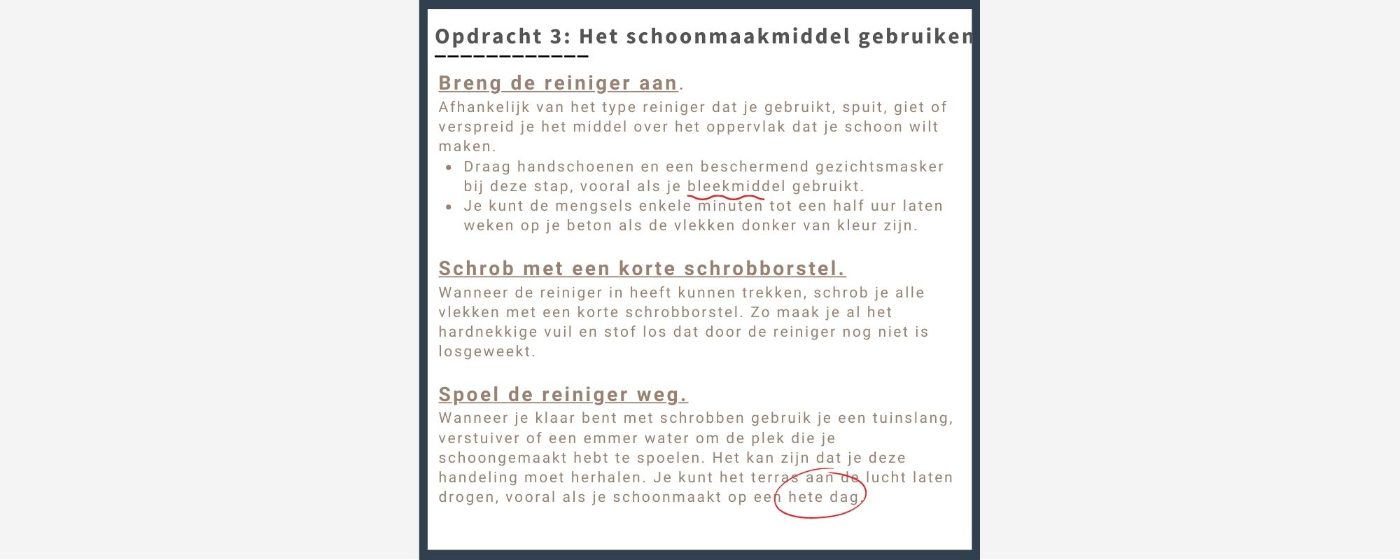 => Een terras enkel met water afspuiten op een hete dag kan prima. Maar werk nooit op een hete dag met reinigingsproducten, deze mogen zeker niet opdrogen.