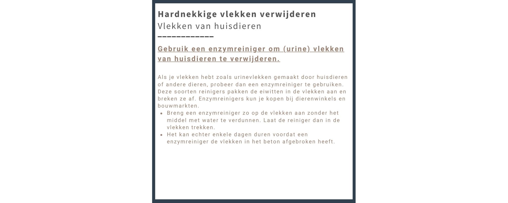 Hoe langer u een product laat liggen op het beton, hoe meer het product in het beton kan indringen. Alles wat intrekt, zowel product als vlekken, komt onder de huid te zitten. Helaas, alles die onder de huid zit, kan niet meer weggehaald worden. Ligt de vlek op het beton, dan is de kans groot dat u deze kan verwijderen, mét de juiste producten.