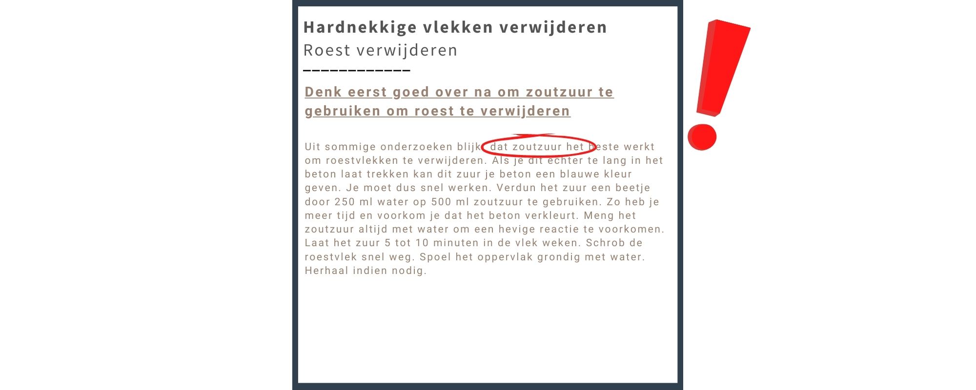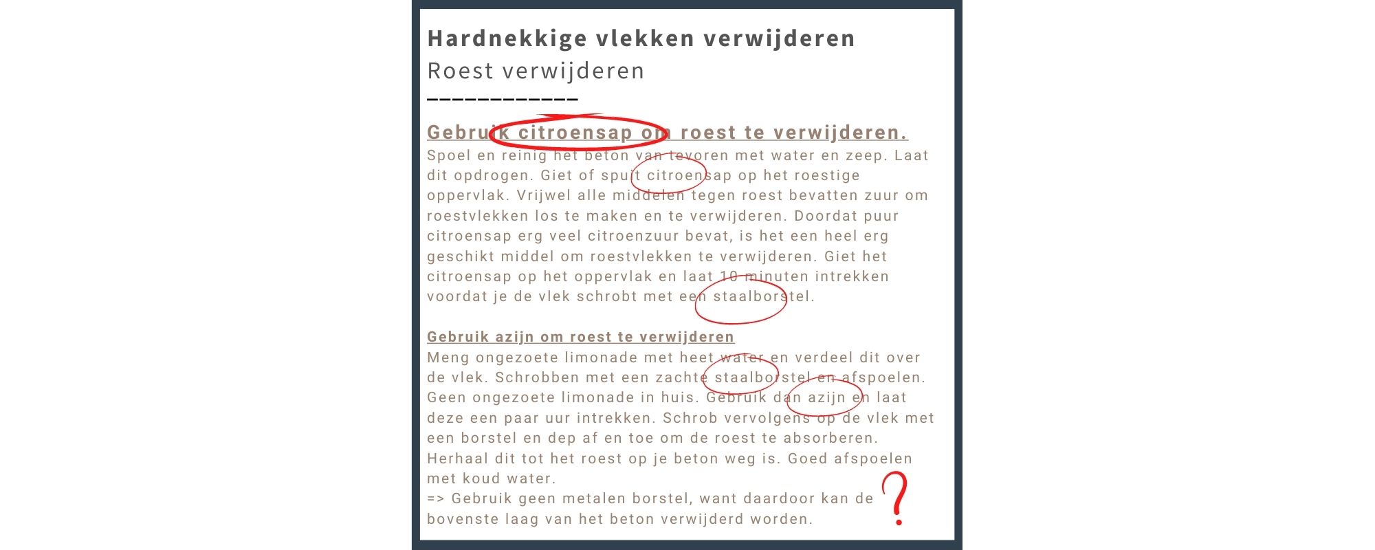 Gebruik nooit een staalborstel op beton. De staalborstel kan zorgen voor krassen in de beton en het kan zelfs zorgen voor extra roestvlekken.